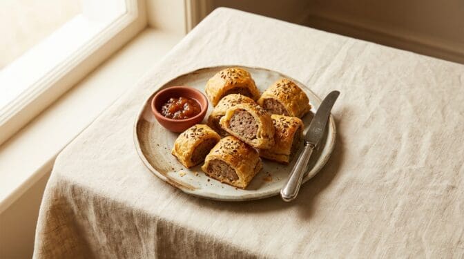 The sausage roll the bakery ought to be selling but isn’t. Pork mince with proper fat, fennel seeds toasted in a dry pan, a bit of chopped sage, soft breadcrumbs that have soaked in milk for five minutes, an egg to bind, all packed into store-bought puff pastry, sliced into 24 rolls and baked until the bottoms are dark golden and the tops are flaky enough to shatter. Ten dollars of ingredients, twenty-four rolls, every man at the BBQ asks for the recipe.