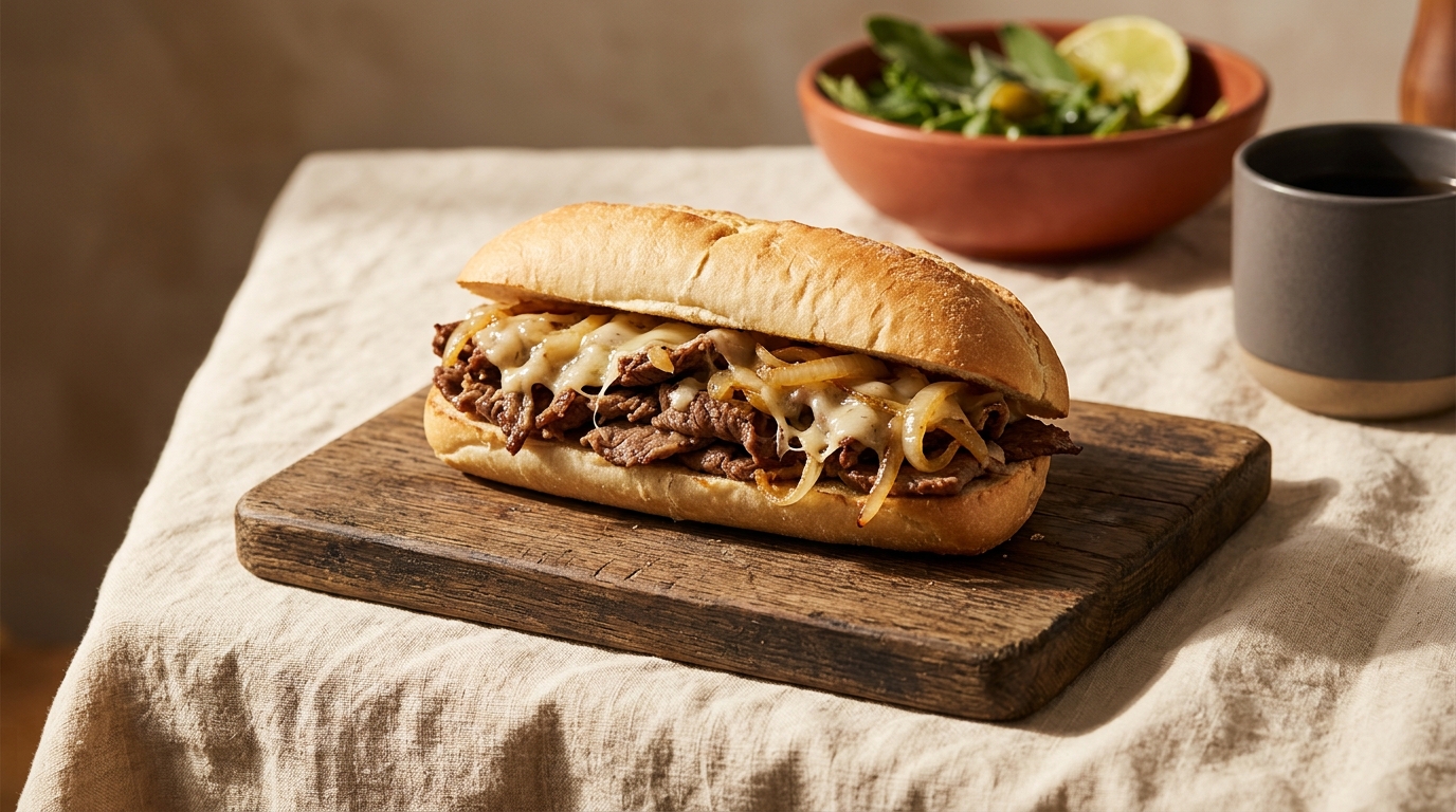 Real Philly cheesesteak is shaved beef, sweated onions, and melted cheese in a soft hoagie roll. That’s it. The rest is regional argument: provolone or American? With or without onions? Cheese Whiz, blasphemously? You decide.