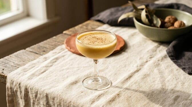 Old-school flip. Rye, honey, whole egg, nutmeg. Boozy, custard-like, surprisingly drinkable.