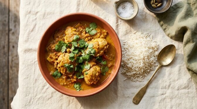 The trick is blooming the spices in oil before anything else happens. Five minutes in a hot pan with the diced onion, until the kitchen smells like a Newtown curry house at 7pm on a Friday. Then everything joins the slow cooker. Bone-in thighs, never breast (breast goes to wood after six hours). Cream goes in last, in the final thirty minutes, otherwise it splits. Top with chopped fresh coriander and a fat squeeze of lime. Serve with basmati rice, a side of cucumber-and-mint raita, naan from a tandoori shop or Bourke Street Bakery’s flatbread, mango chutney from a jar.