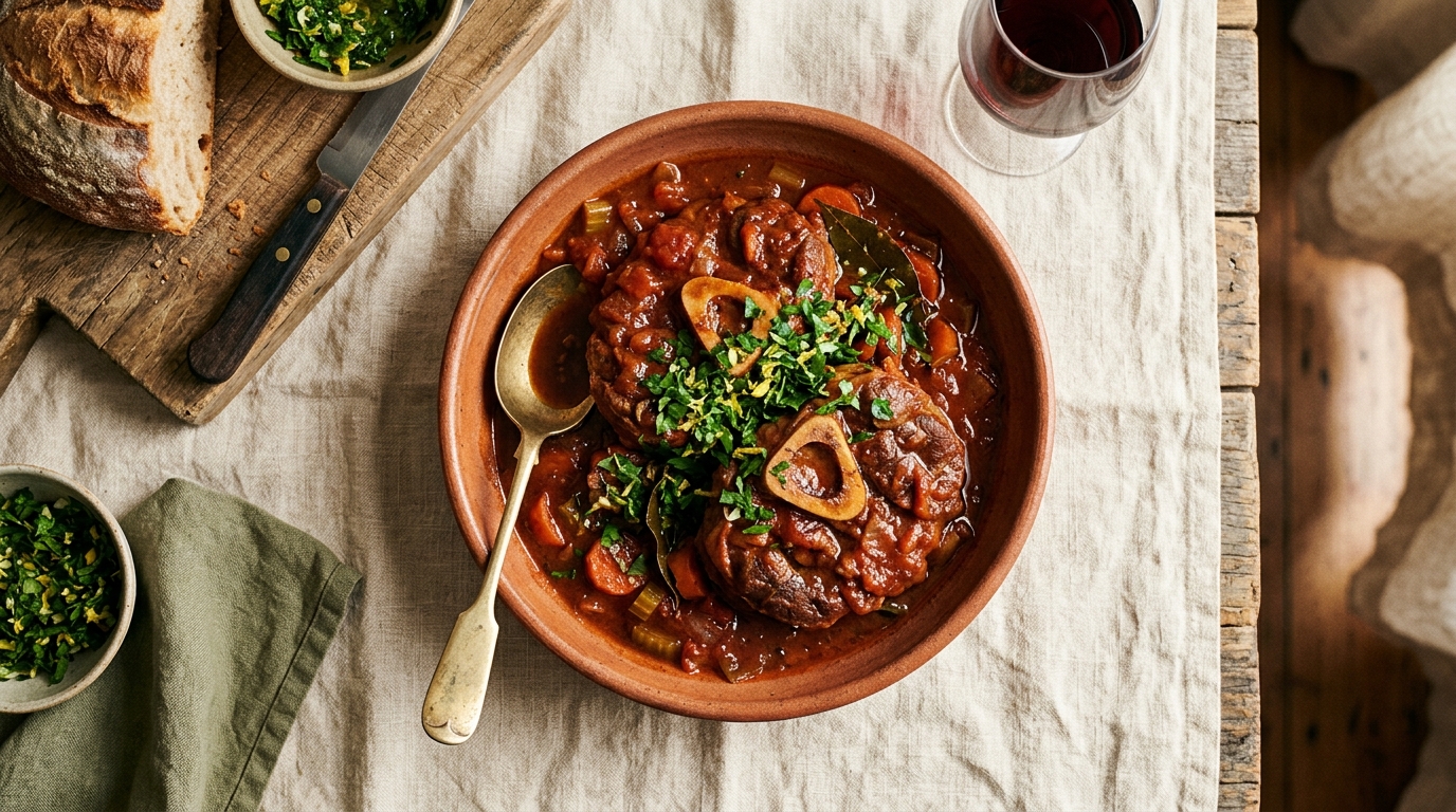 The Milanese masterclass made hands-off. Four veal shanks, each tied with kitchen twine so they hold their shape through the long cook, dusted in seasoned flour, browned hard in a heavy pan, then dropped into the slow cooker with soffritto, white wine, San Marzano tomatoes, beef stock, rosemary and bay. Seven hours on low. The marrow goes silky in the bone, the meat falls off the bone, and the sauce thickens into the kind of dinner that makes a Tuesday feel like a Saturday.