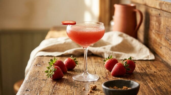 Forget the frozen slushy machine. A real strawberry daiquiri uses fresh ripe strawberries muddled with the lime, shaken over ice, served UP in a coupe. Bright pink, mostly rum, actually a serious drink.