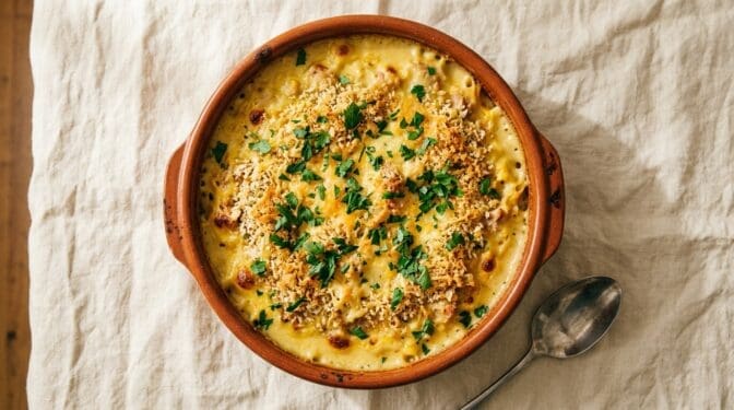 The Australian school-night classic. Pasta, tinned tuna, mornay sauce, breadcrumbs on top, into the oven. Twenty minutes work, kids will eat it, freezes well.