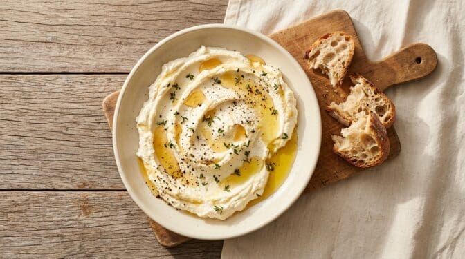 The whipped feta is the dip that stole Australian summer entertaining in the last decade. A blender. A block of good feta. Greek yoghurt. Lemon zest. Olive oil. Ten minutes, and you have the creamy, salty, lemon-bright dip that everyone asks for the recipe of. Spread it thick on a board, drip honey on top, add cracked pepper, scatter thyme. Serve with anything – crackers, pita, warm sourdough, carrot sticks, a spoon.
