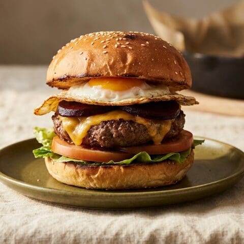 Build: bottom bun, BBQ sauce, lettuce, tomato slice, beetroot slice, beef-with-cheese, fried egg, fried onion, BBQ sauce or tomato, top bun.