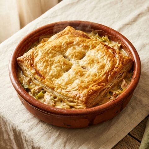 Roll the pastry sheet to fit the top of the dish. Lay it over. Brush with beaten egg. Cut 4 small slits in the top to vent steam.