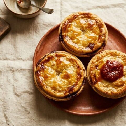 Cut shortcrust to fit pie tins. Fill with cooled beef mixture. Top with puff pastry. Crimp edges. Egg wash.