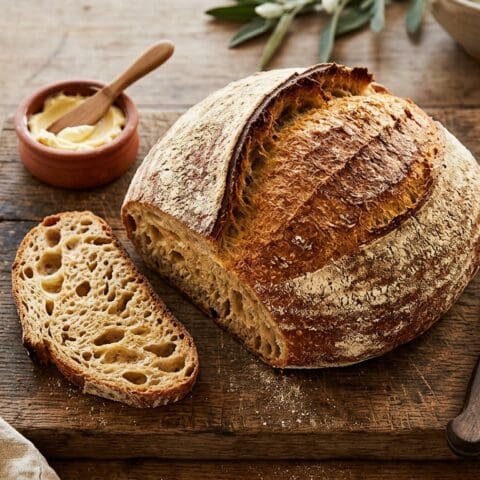 Cover, bake 20 min. Remove lid, reduce to 220°C, bake another 20-25 min until deep brown and hollow-sounding when tapped.