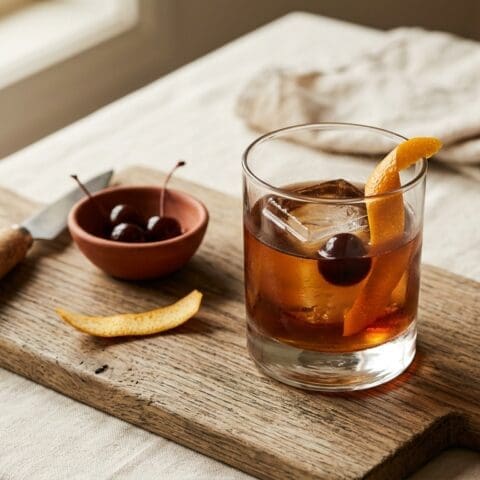 Bourbon, sugar, bitters, a large ice cube, an orange peel. The template for every whisky cocktail worth drinking.
