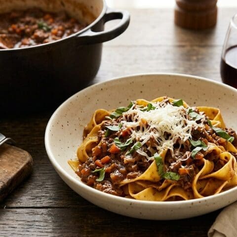 Beef and pork mince, soffritto, red wine, milk, a long afternoon on the stove. Tossed through fresh pappardelle. The Sunday pasta that justifies a bottle.