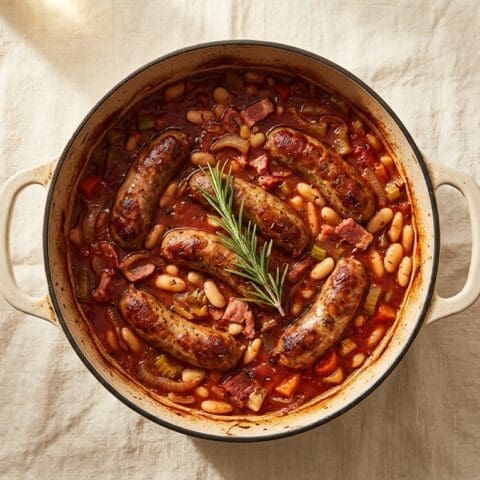 Preheat oven to 180°C fan. Heat 2 tbsp oil in a large oven-safe pot. Brown sausages 3 minutes per side. Set aside.