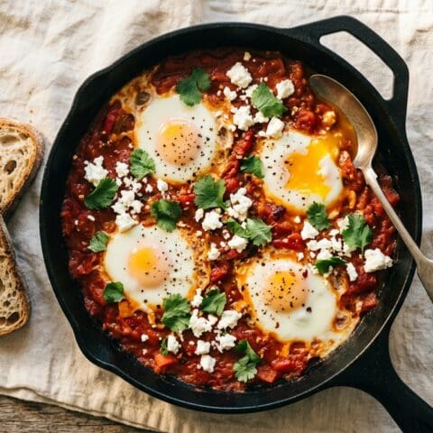 Make 4 wells in the sauce with the back of a spoon. Crack an egg into each.