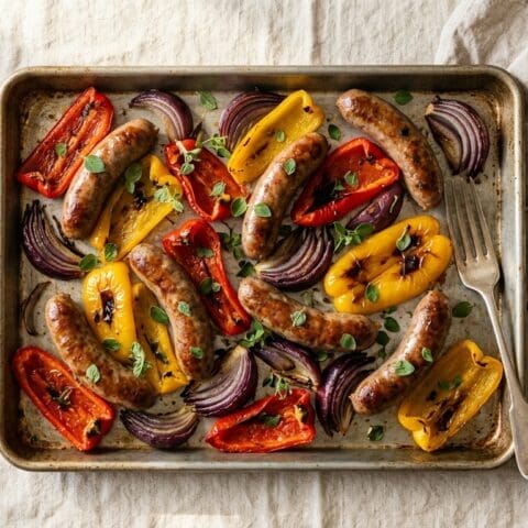 Roast 30 minutes, turning sausages once, until everything is browned and the vegetables are caramelised.