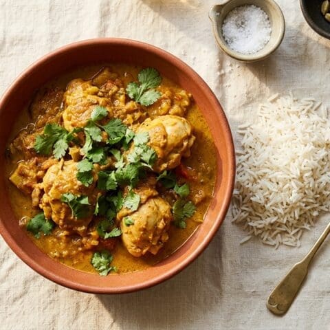 In the slow cooker, combine chicken, onions, garlic, ginger, all spices, tomatoes and tomato paste. Stir to coat. Salt to taste.