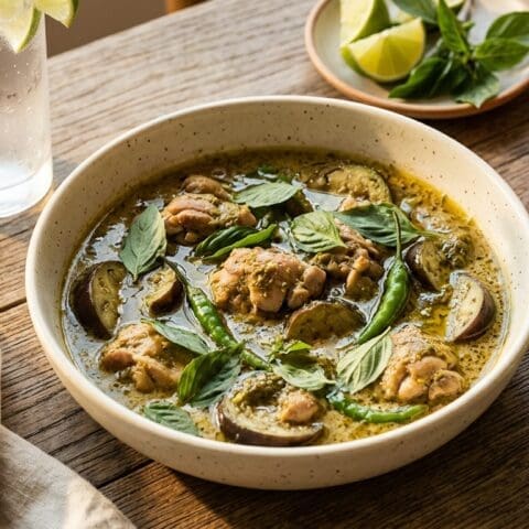 A proper green curry: paste fried in cream, coconut milk, chicken thigh, thai basil, a squeeze of lime. Hot, fragrant, finished in 30 minutes on a weeknight.