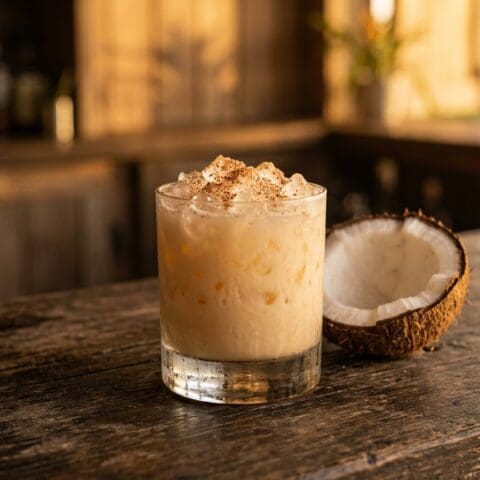 Add rum, pineapple juice, orange juice and cream of coconut to a shaker with ice.